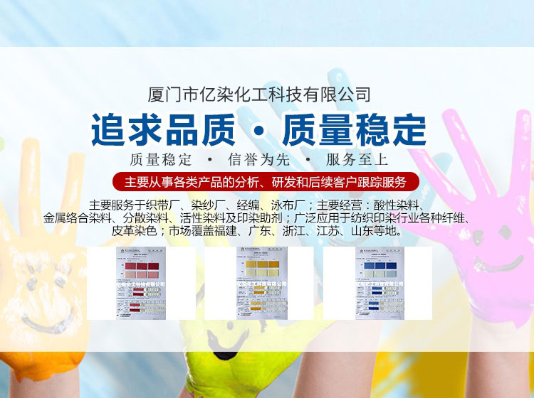 廈門市億染化工科技有限公司是一家集研發(fā)、生產(chǎn)、銷售一體的綜合型企業(yè)。公司主要經(jīng)營(yíng):酸性染料、金屬絡(luò)合染料、高牢度分散染料及印染助劑。公司信守“以誠(chéng)信贏合作、以質(zhì)量贏市場(chǎng)、以創(chuàng)新贏發(fā)展、以服務(wù)贏生存”的企業(yè)精神服務(wù)于廣大客戶,多年以來(lái)建立了良好的市場(chǎng)口碑,市場(chǎng)遍布福建、廣東、浙江、江蘇、山東及東南亞國(guó)家,與多家知名企業(yè)建立了長(zhǎng)期合作伙伴關(guān)系!